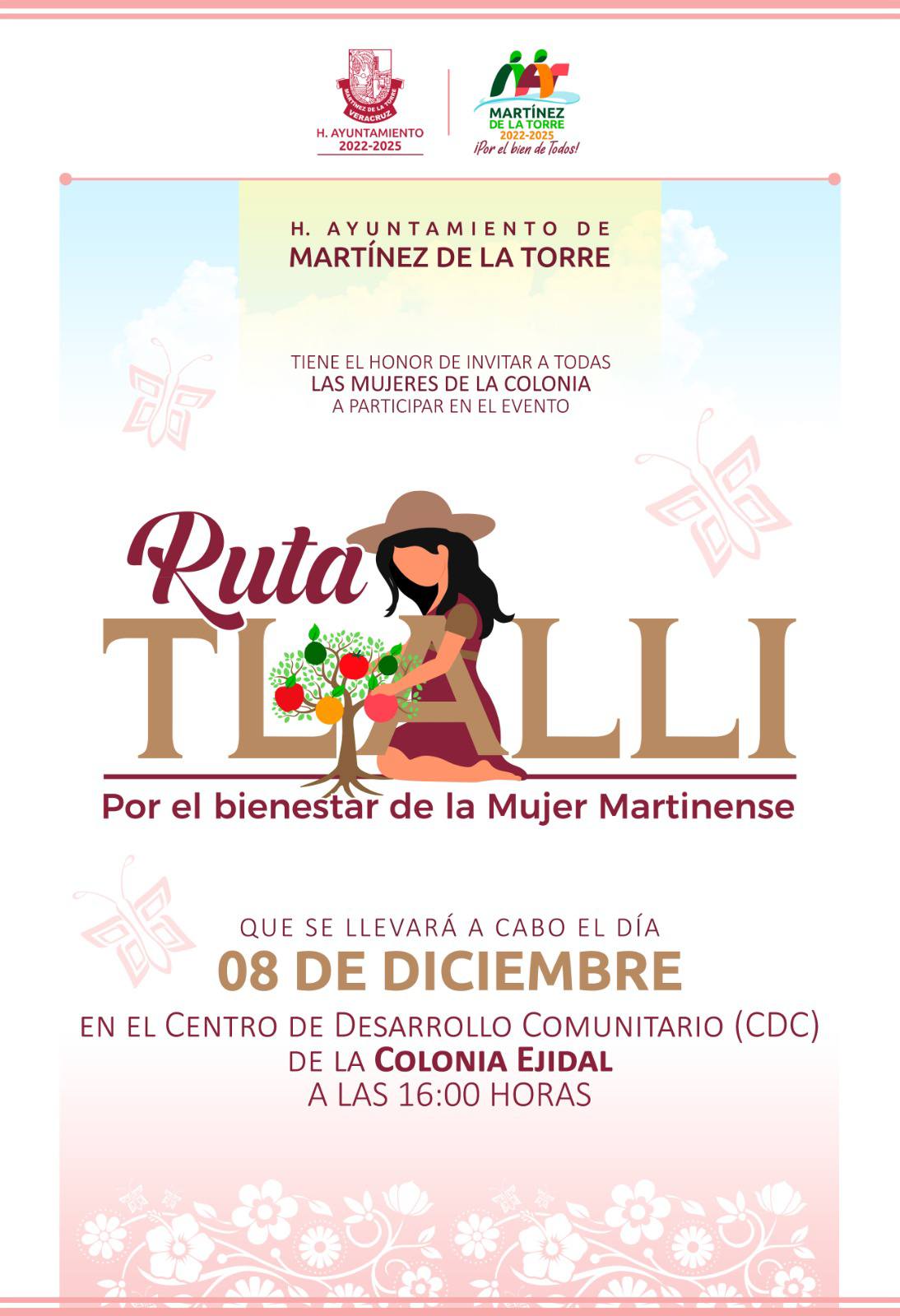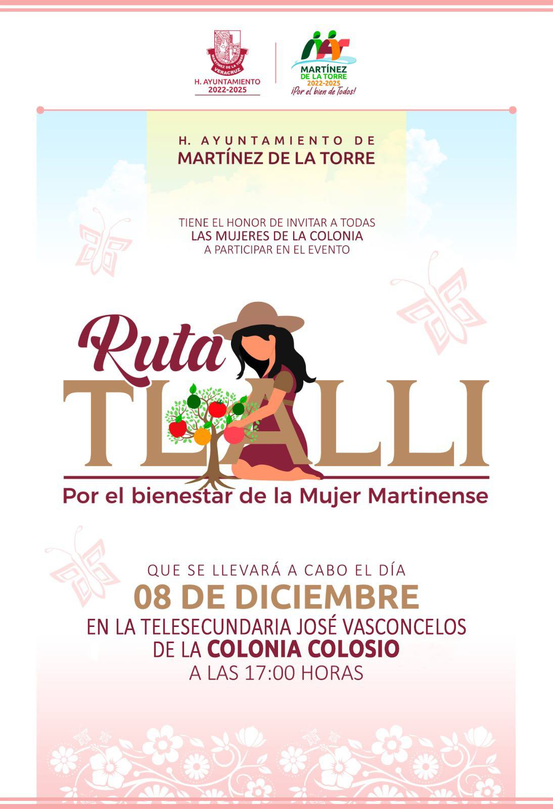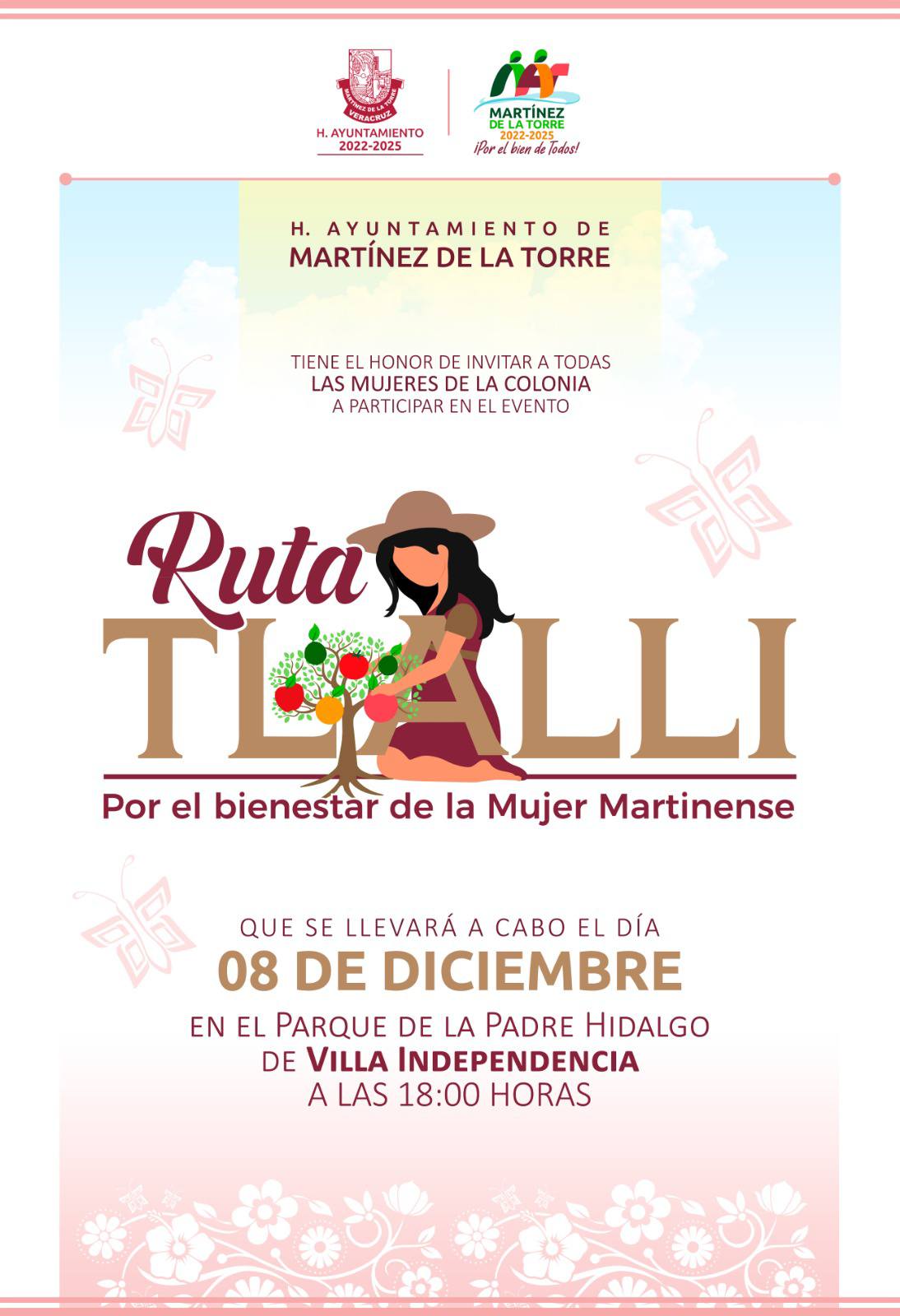 El H. Ayuntamiento de Martínez de la Torre, que preside la Química Alfa Citlalli Álvarez Vázquez te invita a participar en la “Ruta Tlalli” Por el Bienestar de la Mujer Martinense. Una jornada pensada especialmente para ti.