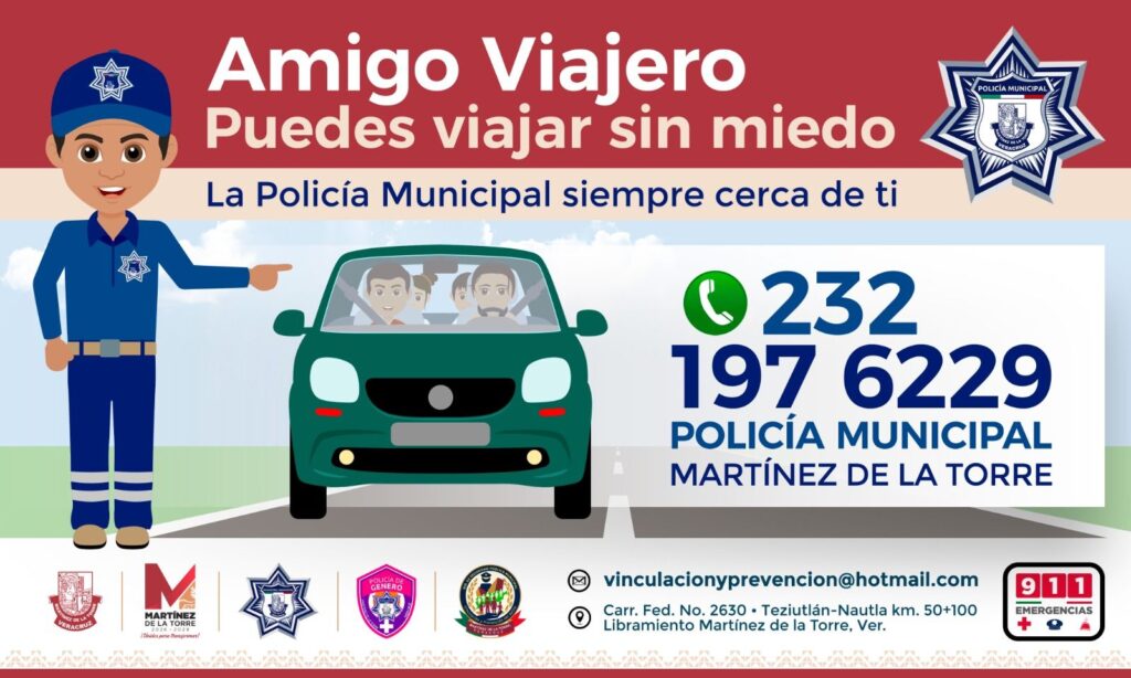 Con el objetivo de fortalecer la seguridad durante esta temporada vacacional, el H. Ayuntamiento de Martínez de la Torre, a través del área de Vinculación y Prevención del Delito, así como de la Policía Municipal, se pone en marcha el programa Amigo Viajero, brindando orientación y acompañamiento a quienes transitan por nuestro municipio.